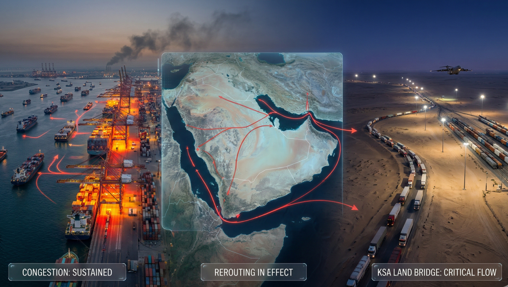 With no clear short-term recovery signals, proactive management remains essential. Saudi Arabia continues to emerge as one of the most stable logistics hubs for regional rerouting.