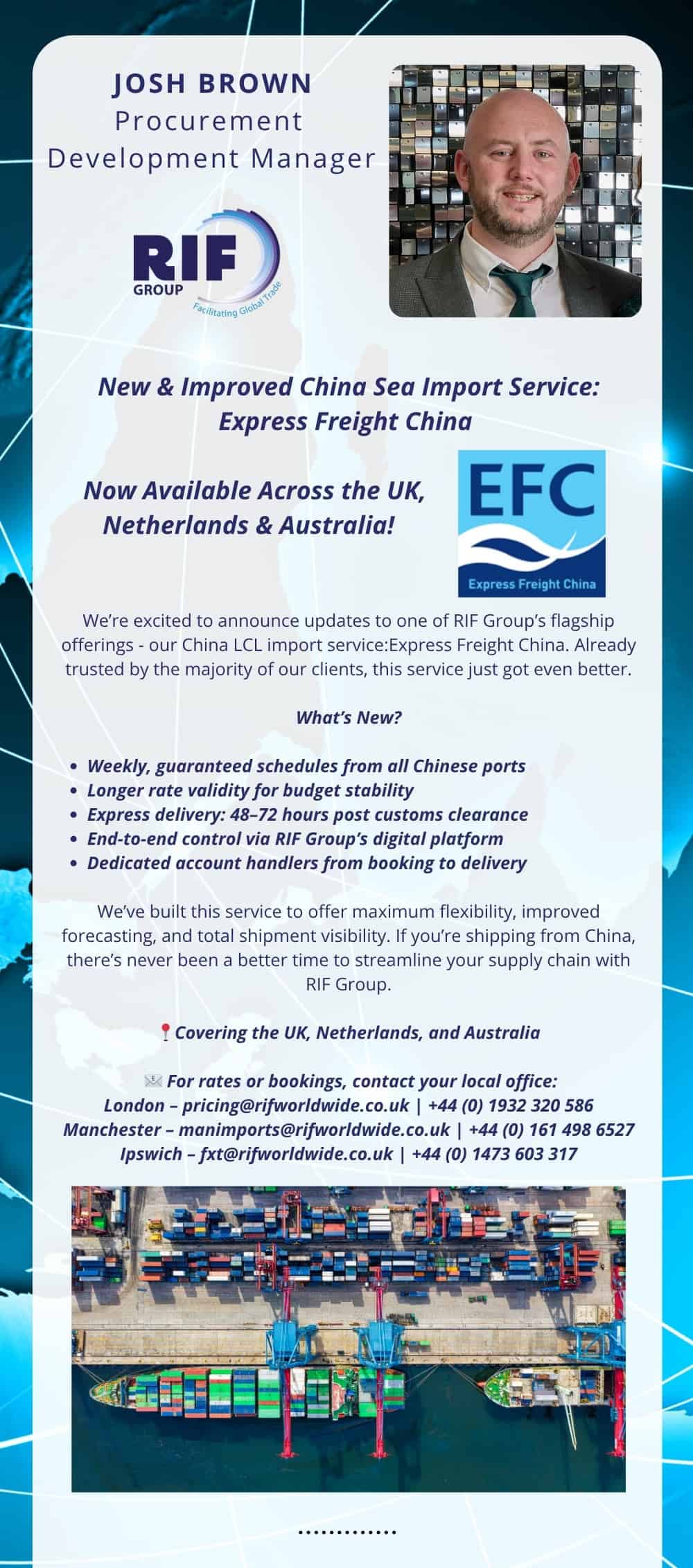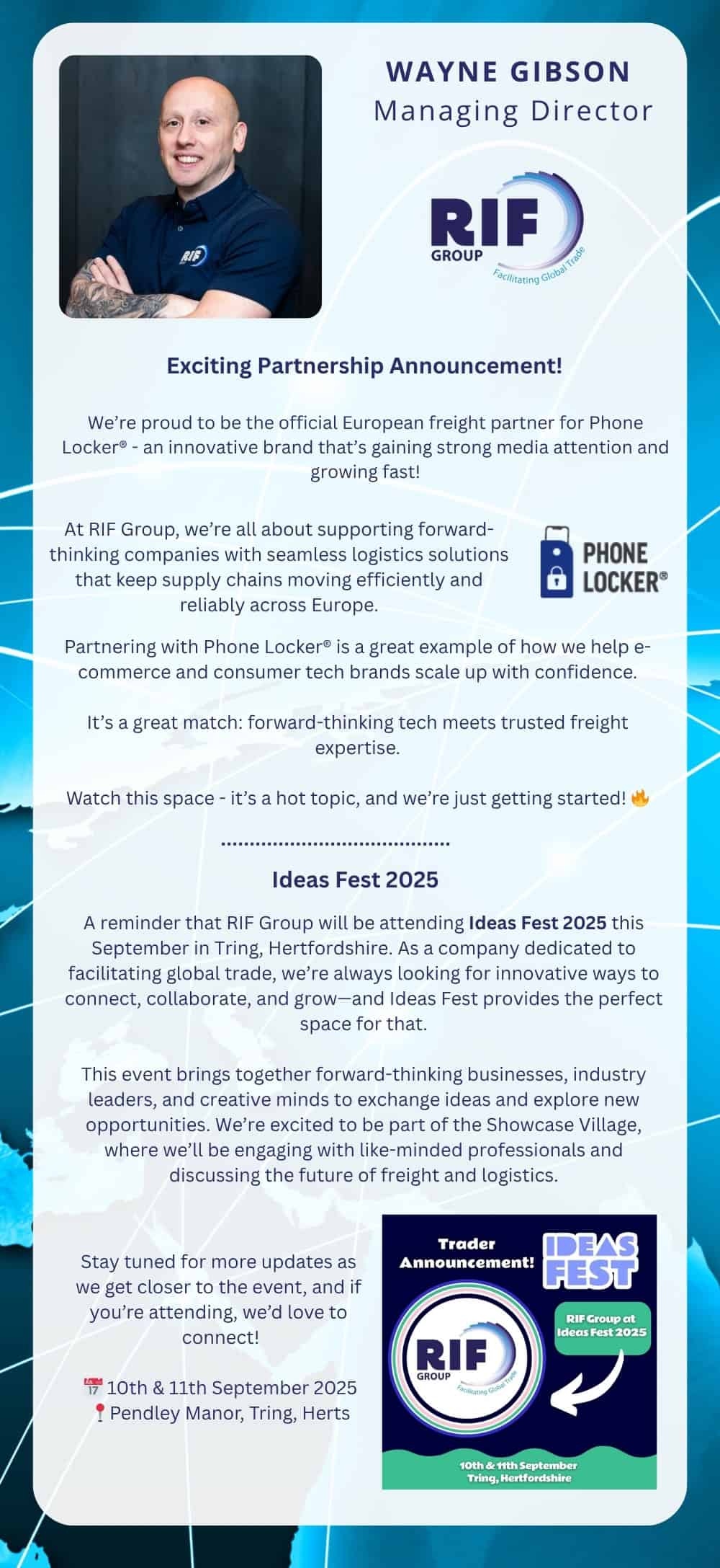 RIF Worldwide Plc © 2025 all rights reserved | GDPR RIF Worldwide Plc | GDPR RIF Logistics Ltd | Modern Slavery Statement | The Customs Declaration Service | RIF Logistics Terms and Conditions | RIF Worldwide Plc Terms and Conditions | RIF Europe Trading Conditions | RIF Europe Warehousing Conditions | Website Terms of Use | Privacy Policy
